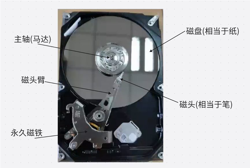 主轴通电后会带动磁盘转动,磁头臂带动磁头左右摆动。磁头与盘片是不接触的,磁头与盘片的距离非常小,盘片高速旋转,磁头左右偏动,若磁头磁盘接触,就会摩擦生成热,高温就会消磁,消磁就会丢失数据。