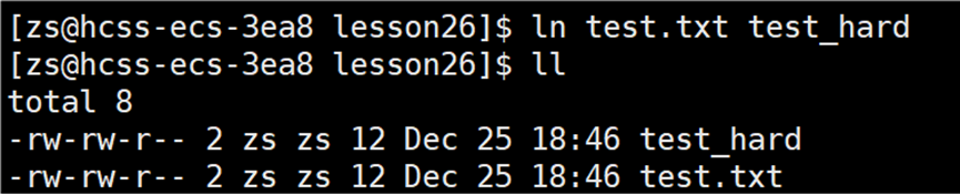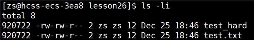 知道怎么建立硬链接,那么什么是硬链接?我们再来查看 test_hard 和 test.txt 文件的 inode 编号。