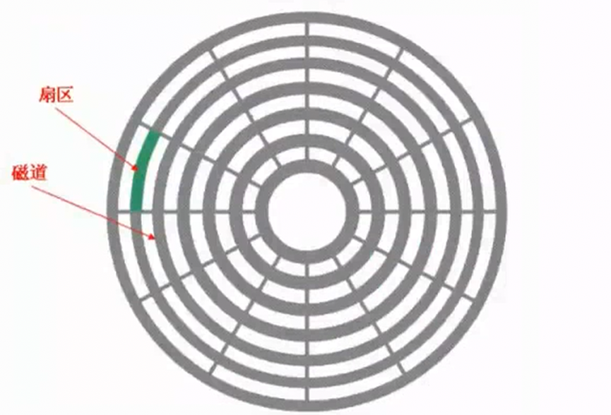 一圈为一个磁道,一个磁道上有多个扇区。一个盘片有两面,正反两面都可以存储数据。