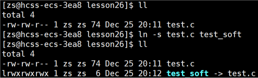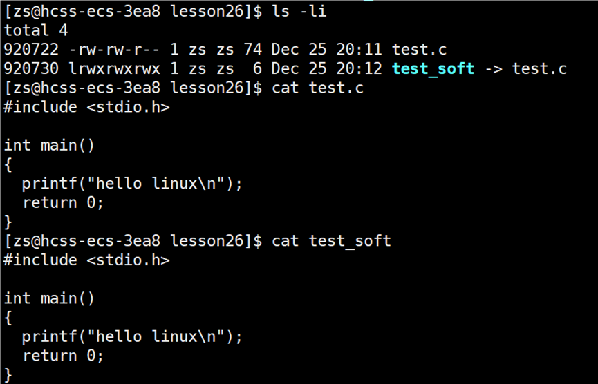 可以看出 test.c 与软链接的 inode 编号并不一样,软链接有自己的 inode 编号,并且软链接的文件属性l,因此可以知道软链接是一个独立的链接文件。文件=文件内容+文件属性,文件属性与 test.c 的差不多,那么软链接的文件内容是什么?我们直接查看软链接的内容是查看不到,最终看的也只是 test.c 的内容(test.c 和软链接的文件大小都不一样,但是查看的内容是一样的)