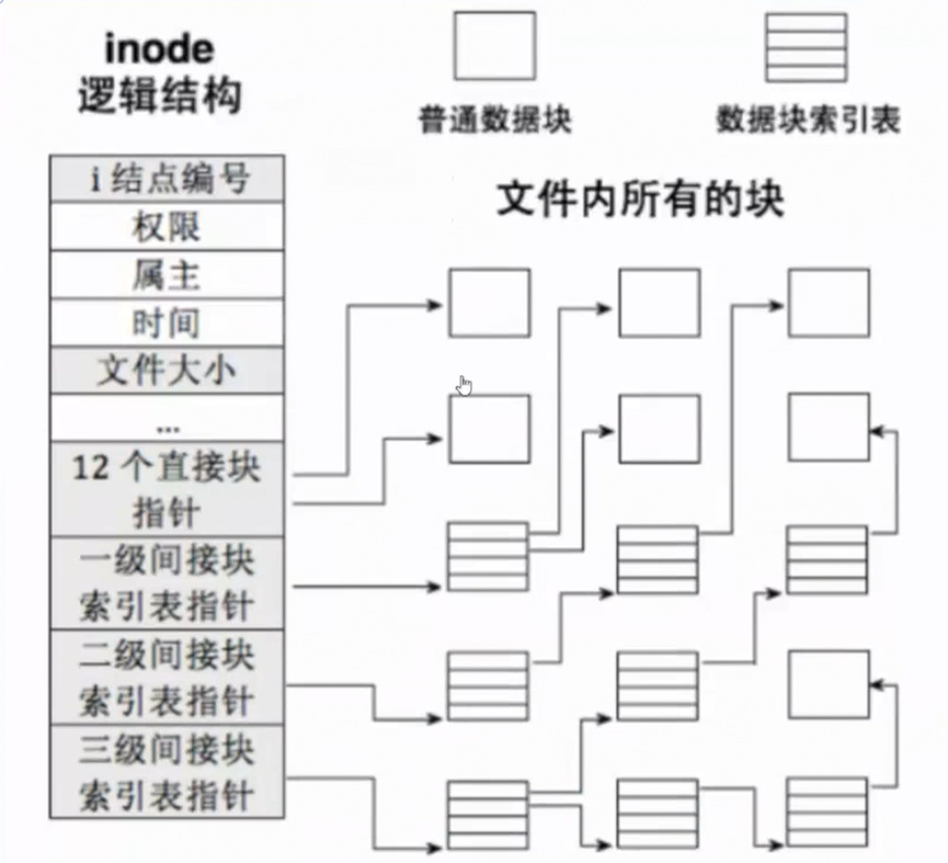 __le32 i_block[EXT2_N_BLOCKS] 可以存储15个块指针,前 12 个(索引 0 到 11)是 直接块指针,每个直接指向一个数据块。第 13 个(索引 12)是 一级间接块指针,指向一个包含更多数据块指针的块,一级间接块可索引 1024 【一个一级间接块的大小为4KB,一个数据块的块号大小为4byte,4*1024byte / 4byte = 1024】个数据块,共 1024 × 4KB = 4,194,304 字节 = 4MB。第 14 个(索引 13)是 二级间接块指针,指向一个包含一级间接块指针的块,一个二级间接块可索引1024个一级间接块,一级间接块可索引 1024 个数据块,所以一个二级间接块可以存储1024*1024*4KB = 4GB。第 15 个(索引 14)是三级间接块指针,指向一个包含二级间接块指针的块,一个三级间接块可索引1024(4*1024/4)个二级间接块,一个二级间接块可索引1024个一级间接块,一级间接块可索引 1024 个数据块,所以一个三级间接块可以存储1024*1024*1024*4KB = 4TB。