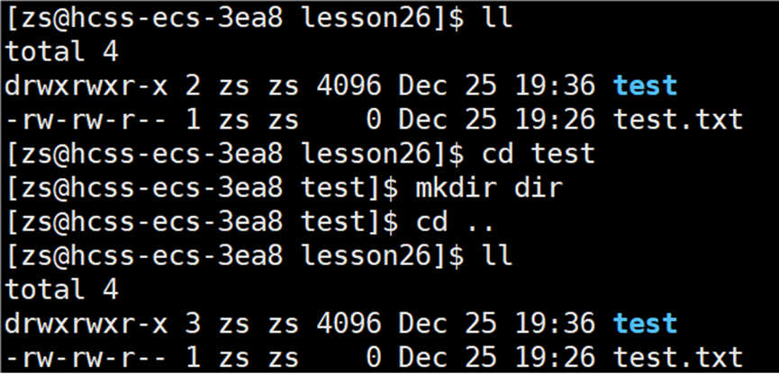 现在 test 目录的硬连接数为2,打开 test 目录,在目录中新建一个目录,看 test 目录的硬链接数会发生什么变化?