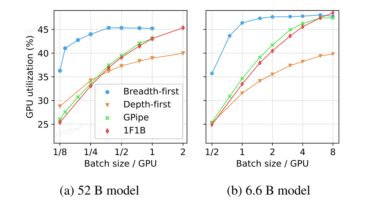 我们提出"广度优先流水线并行"这一创新训练方案,通过优化流水线并行与数据并行的协同作用,显著提升训练效率。该方案通过高GPU利用率与小批量处理相结合,同时充分利用完全分片的数据并行特性,有效降低训练时间、成本和内存占用。实验数据显示,相较于Megatron-LM模型,采用小批量处理的520亿参数模型训练吞吐量最高提升43%,若在大型GPU集群上实施,训练时间和成本的节省幅度同样可达43%。