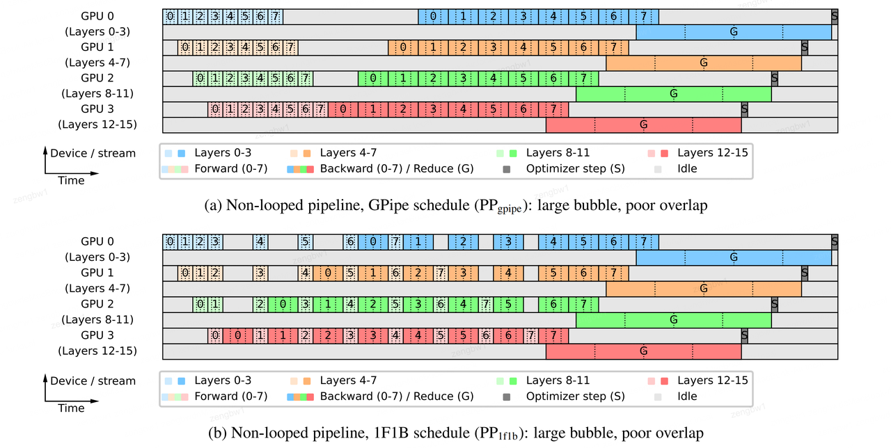 - 优点:缩短了流水线气泡(设备空闲等待时间),从而允许使用更小的批次大小来达到高利用率。