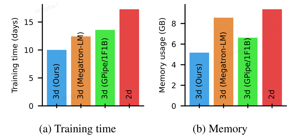 图1:采用我们的方法(广度优先流水线并行性)在4096个Nvidia V100 GPU集群上运行520亿参数模型时,预测的训练时间(a)与内存使用量(b)对比3D和2D基线模型。