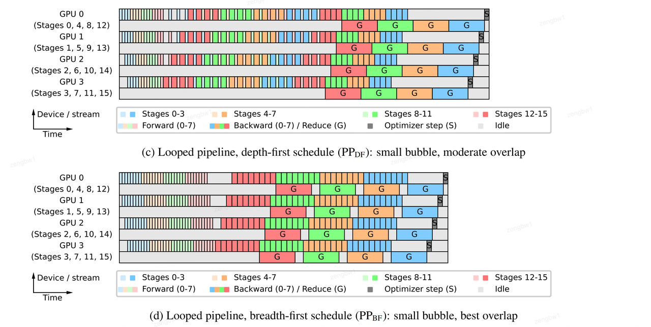 广度优先调度 :这是BF-PP的核心创新。传统流水线并行(如GPipe)使用深度优先调度:一次性将多个微批次送入流水线的第一阶段,逐层向前推进。这会导致较早阶段的激活值在内存中留存很长时间,内存占用高。