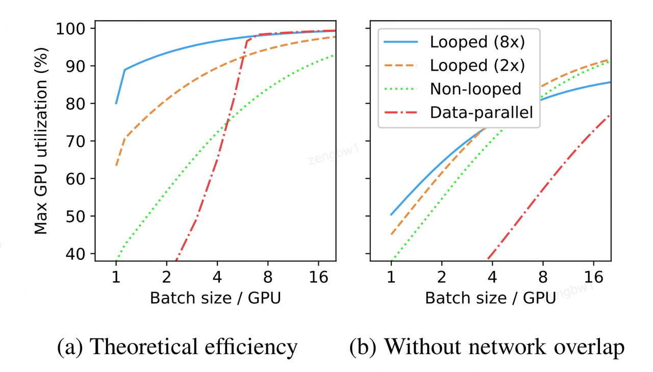 图2:(a)比较循环与非循环流水线及纯数据并行处理的理论效率随GPU批量大小变化的函数关系,以 βnet =6、NTP=1为例。注意 βmin =1附近与流水线-并行网络重叠相关的显著跃升。(b)相同配置下无数据与流水线网络重叠的理论效率,该图凸显了循环流水线中网络重叠的重新重要性。