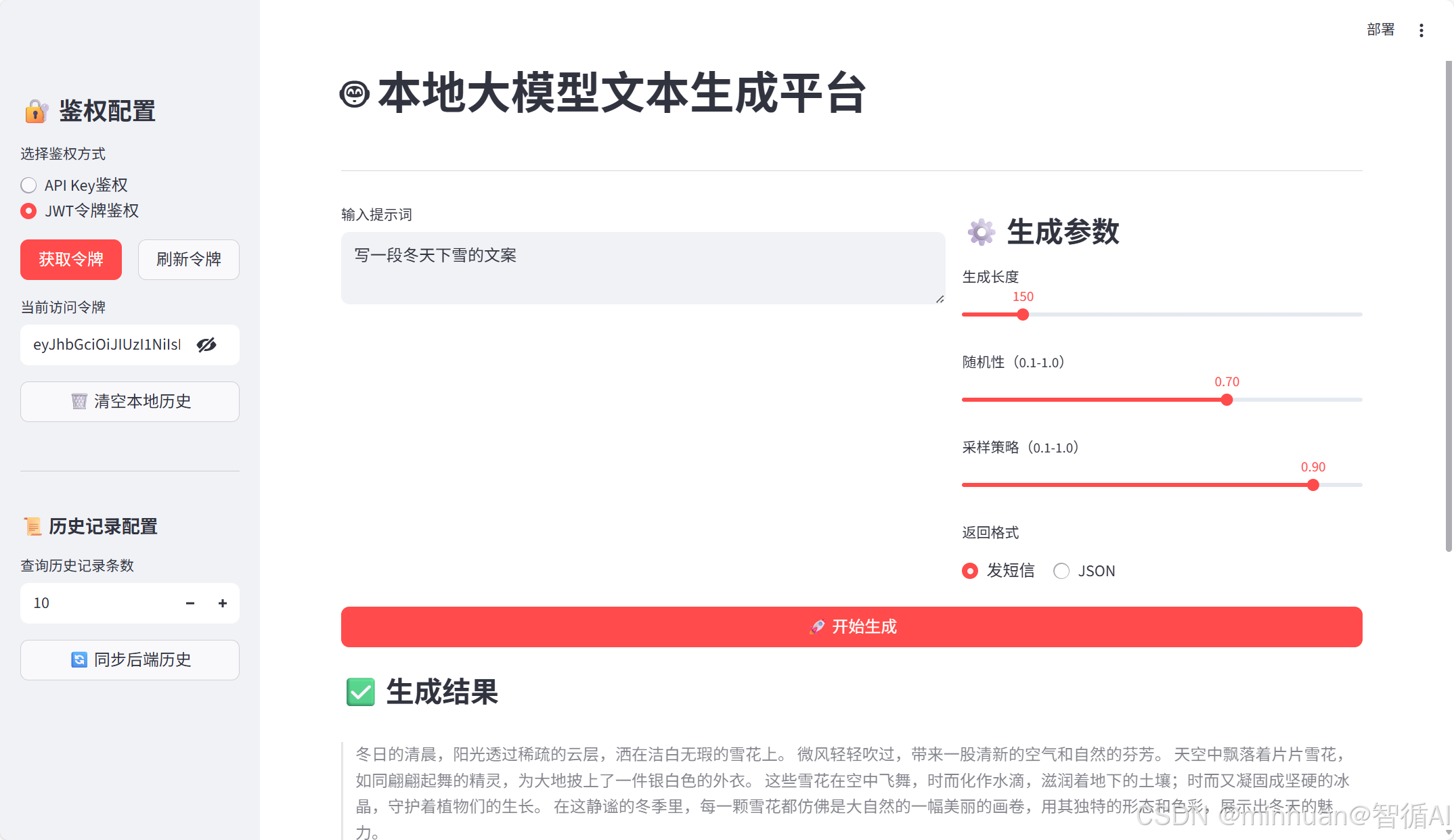 - 以可读格式展示生成文本,同步更新历史记录列表
