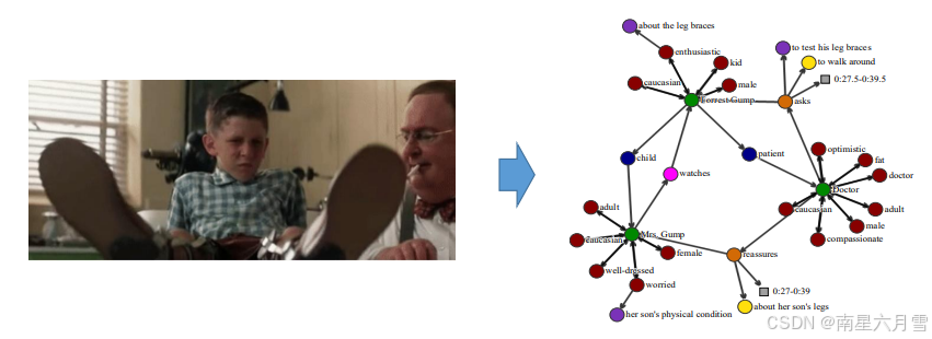 - 基于场景图的细粒度视频描述:借助场景图(Scene Graph)技术,实现视频内各种主体及其关系的描述。然而,此类方法受限于语义信息的获取难度,在图结构的自动构建上仍存在诸多瓶颈。(场景图可以参考下图右侧所示)