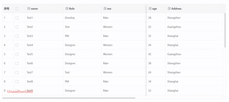 { id: 10011, name: 'Test11', role: 'Designer', sex: '1', num1: 56, num2: 32, num3: 63, age: 52, address: 'Shanghai' },