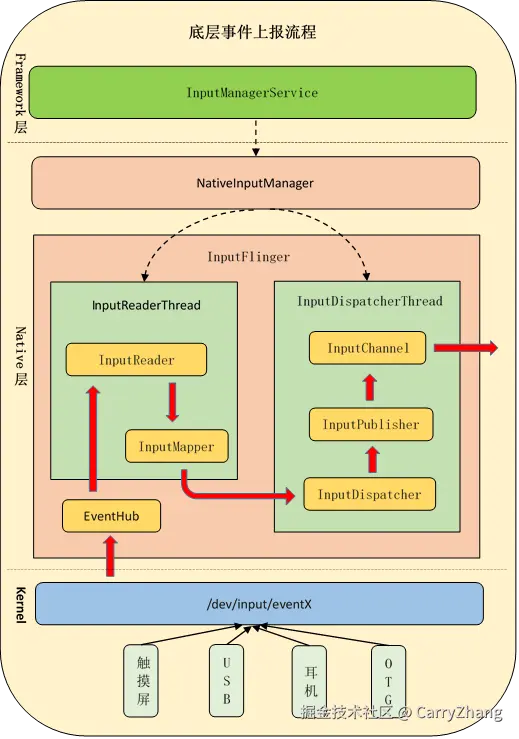 InputReader中的InputThread一直循环从EventHub中读取设备输入的事件和对事件进行封装,同时将事件传递到InputDispatcher的队列中,以便后续的分发。