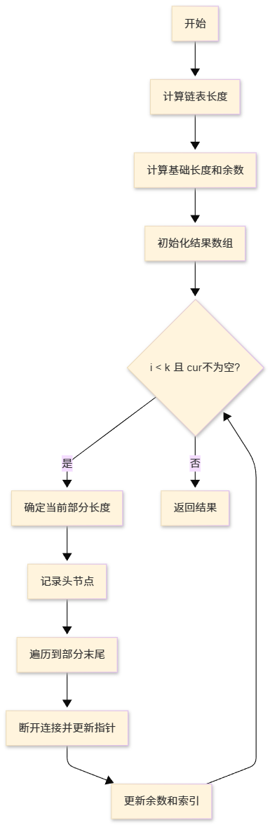 - 遍历分割链表:逐个构造 k 个部分,每个部分取对应长度的节点,注意断开链表的连接(避免各部分相连)。