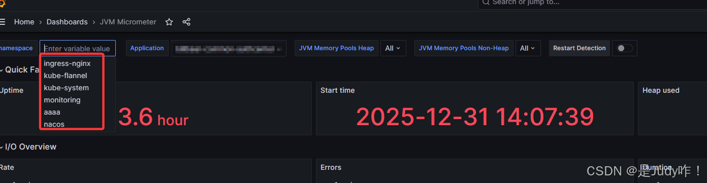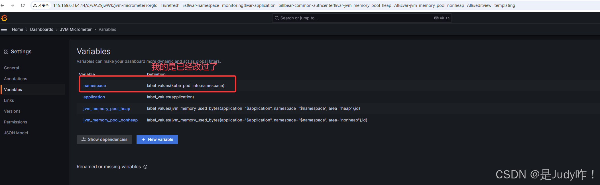 - 5.3、在编辑grafana的jvm监控面板变量设置即可下拉选取命名空间