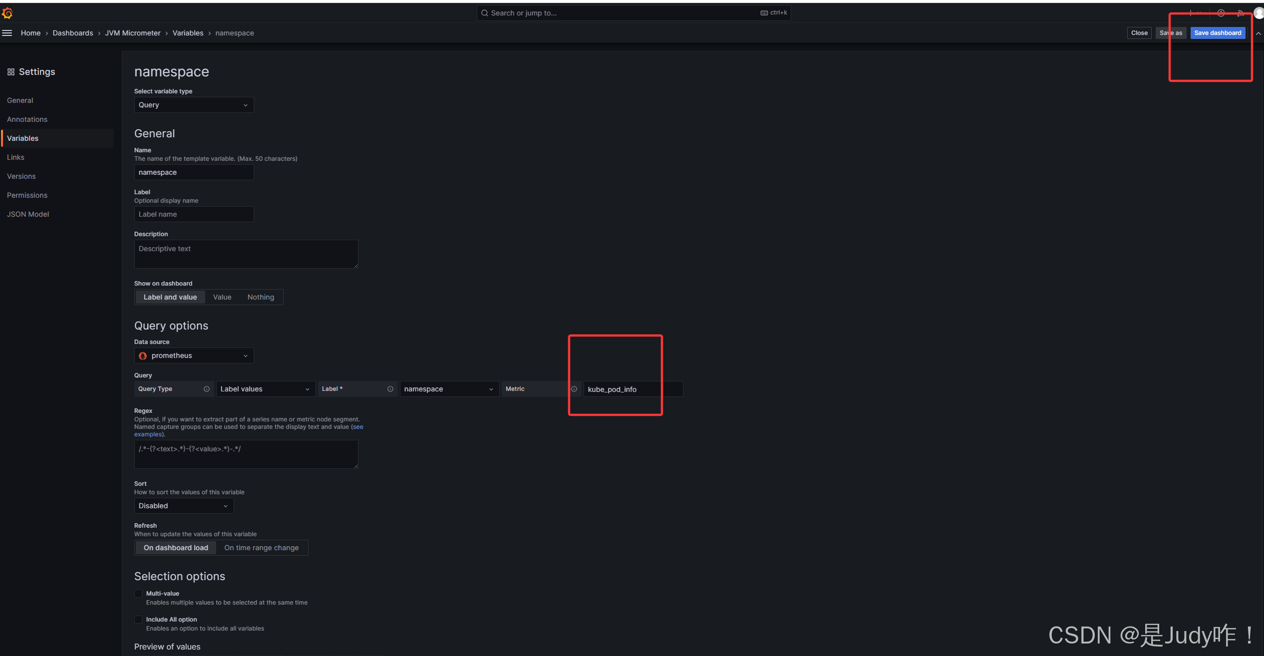 5.3、在编辑grafana的jvm监控面板变量设置即可下拉选取命名空间