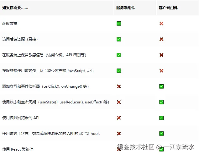 | 服务端组件(SC) | 仅在服务端(Node.js 环境)执行,渲染为 HTML 片段 / React 服务端数据结构 | 可直接访问数据库、后端接口,无浏览器 API 限制,代码不会发送到客户端 |