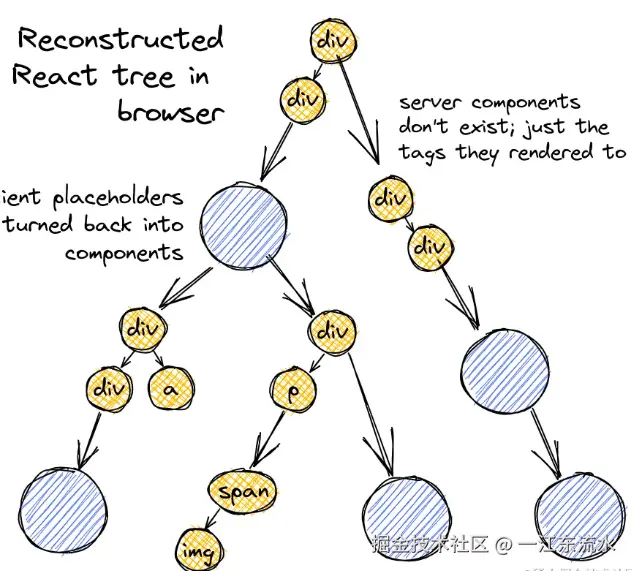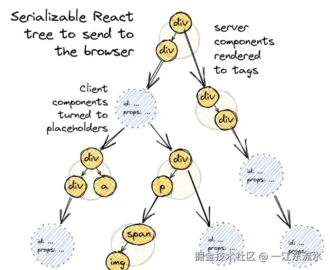 其中黄色节点表示 React Server Component。在服务端,React 会将其渲染会一个包含基础 HTML 标签和客户端组件占位的树。