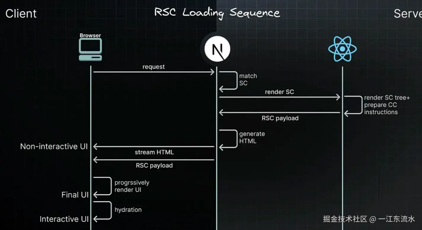注意:上图描述的是页面初始加载的过程。其中 SC 表示 Server Components 服务端组件,CC 表示 Client Components 客户端组件。