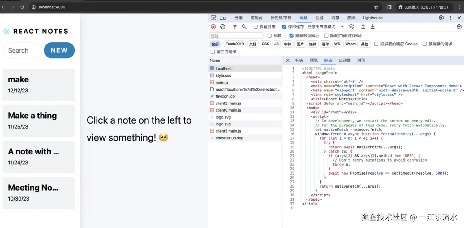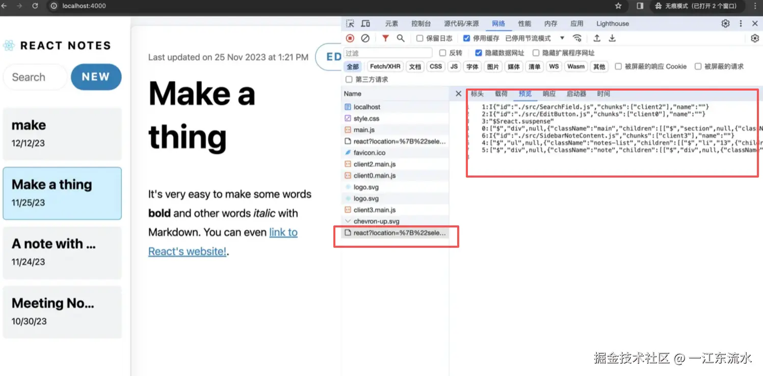 你会发现 localhost 这个 HTML 页面的内容就跟 CSR 一样,都只有一个用于挂载的 DOM 节点。当点击左侧 Notes 列表的时候,会发送请求,这个请求的地址是http://localhost:4000/react?location={"selectedId":3,"isEditing":false,"searchText":""}
