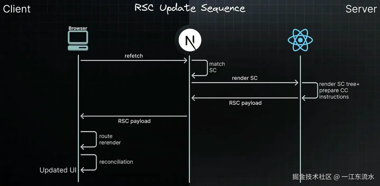 但是 RSC 不同,RSC 会被渲染成一种特殊的格式(RSC Payload),可以多次重新获取,然后客户端根据这个特殊格式更新 UI,而不会丢失客户端状态。