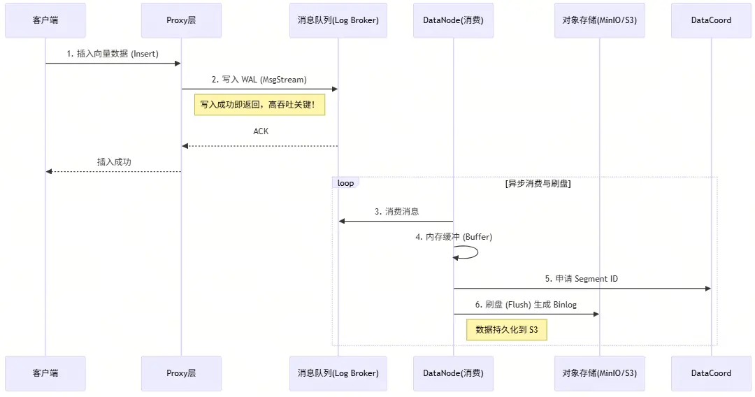 - 这是 Milvus 最精妙的设计! 它用消息队列(默认 Pulsar)来做 WAL(预写日志)。一切操作皆消息,保证了数据的最终一致性。