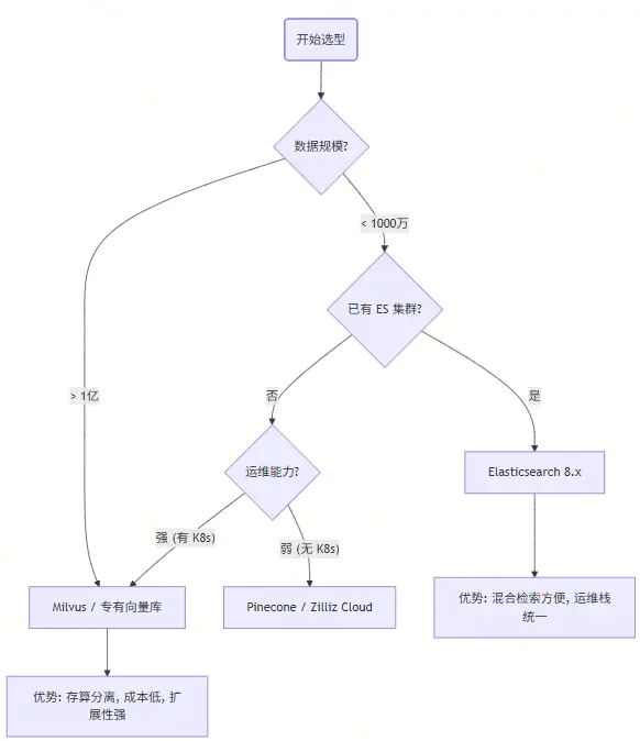 - 选 Elasticsearch:当你数据量中等(千万级),且强依赖"关键词+向量"的混合检索(Hybrid Search),或者不想引入新组件。