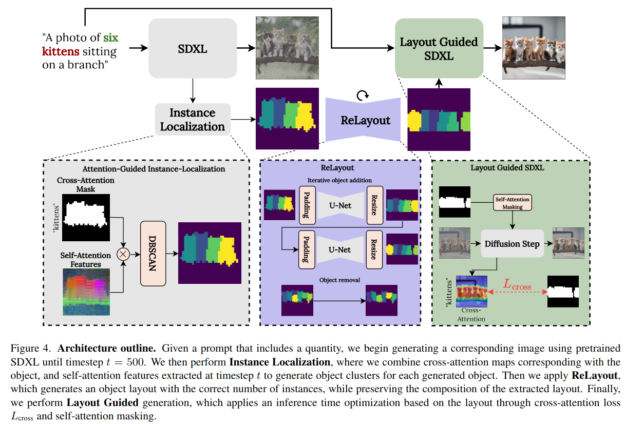 1)输入提示词,借助SDXL模型生成图片,但是在生成过程中(t=500)打断模型,得到一个模糊的图像,进行物体定位,提取模糊的布局图。