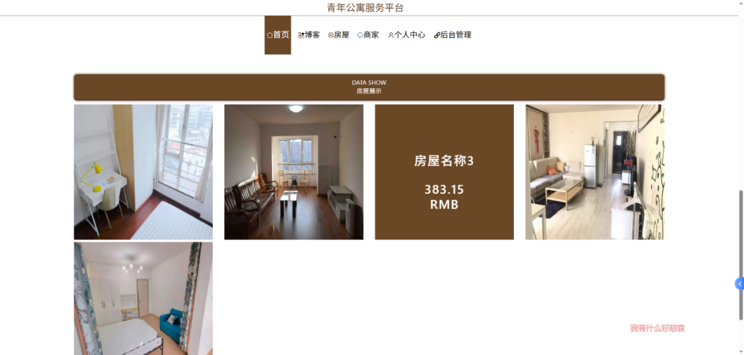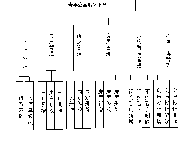 本青年公寓服务平台构建了管理员与用户双权限协同的功能体系:管理员作为核心管理角色,可全面负责用户基本信息的维护与管理,实时处理房屋投诉信息及关联的租赁信息,并能与用户建立双向交流通道以响应需求;用户则拥有便捷的信息查询权限,既可以浏览房屋相关信息,也能查看房屋投诉动态及管理员针对投诉或咨询给出的回复内容,形成 "管理 - 反馈 - 查询" 的完整服务闭环。