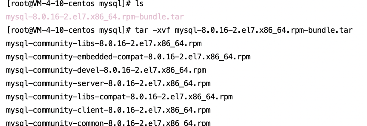 tar -xvf mysql-8.0.16-2.el7.x86_64.rpm-bundle.tar