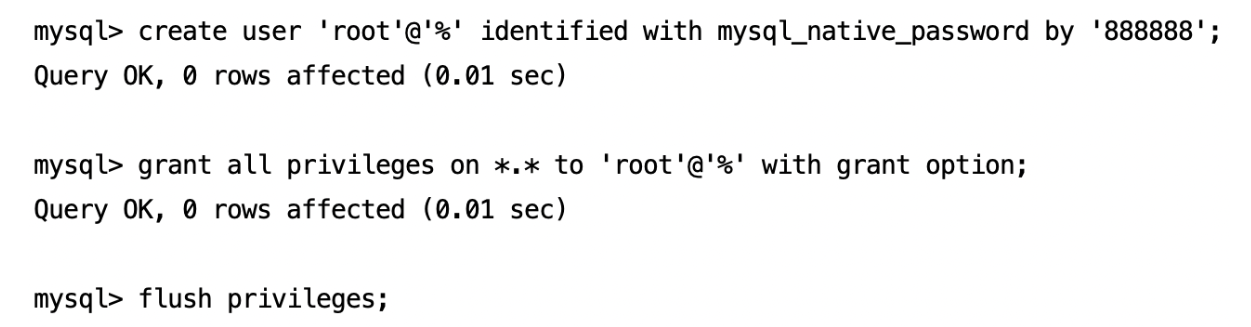 create user 'root'@'%' identified with mysql_native_password by '888888';
