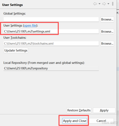 右侧User Settings栏点击Browse,选择你刚创建的settings.xml文件