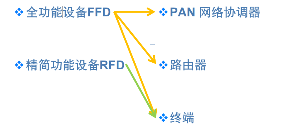 - 精简功能设备(RFD) :只能与FFD通信,通常为终端设备