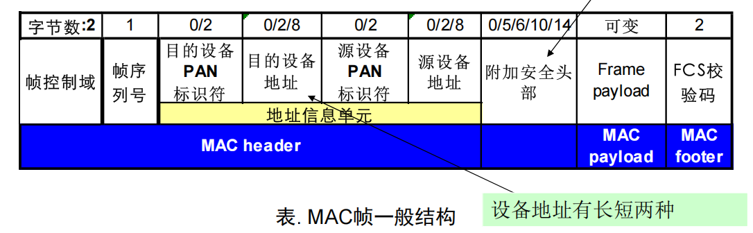 | 地址域(目的/源) | 可变 | PANID + 设备地址 |