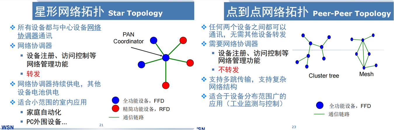 - 点对点拓扑 (Peer-to-Peer):支持多跳,适合工业监测与控制