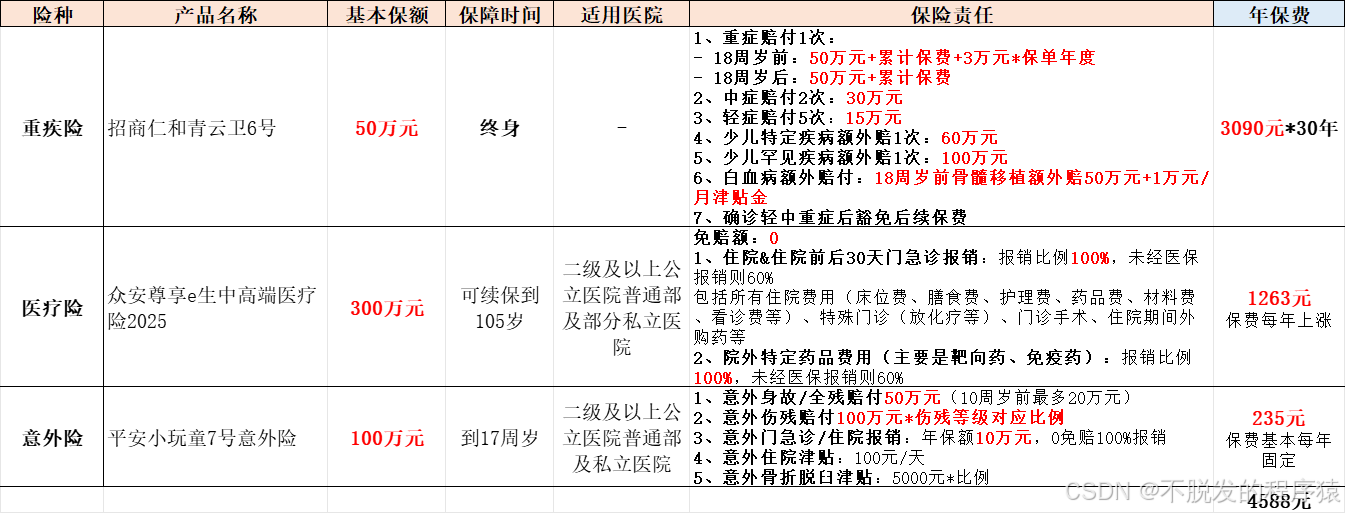 保险经理人根据我们的情况制定了一份方案,将上述四类保险完整涵盖。