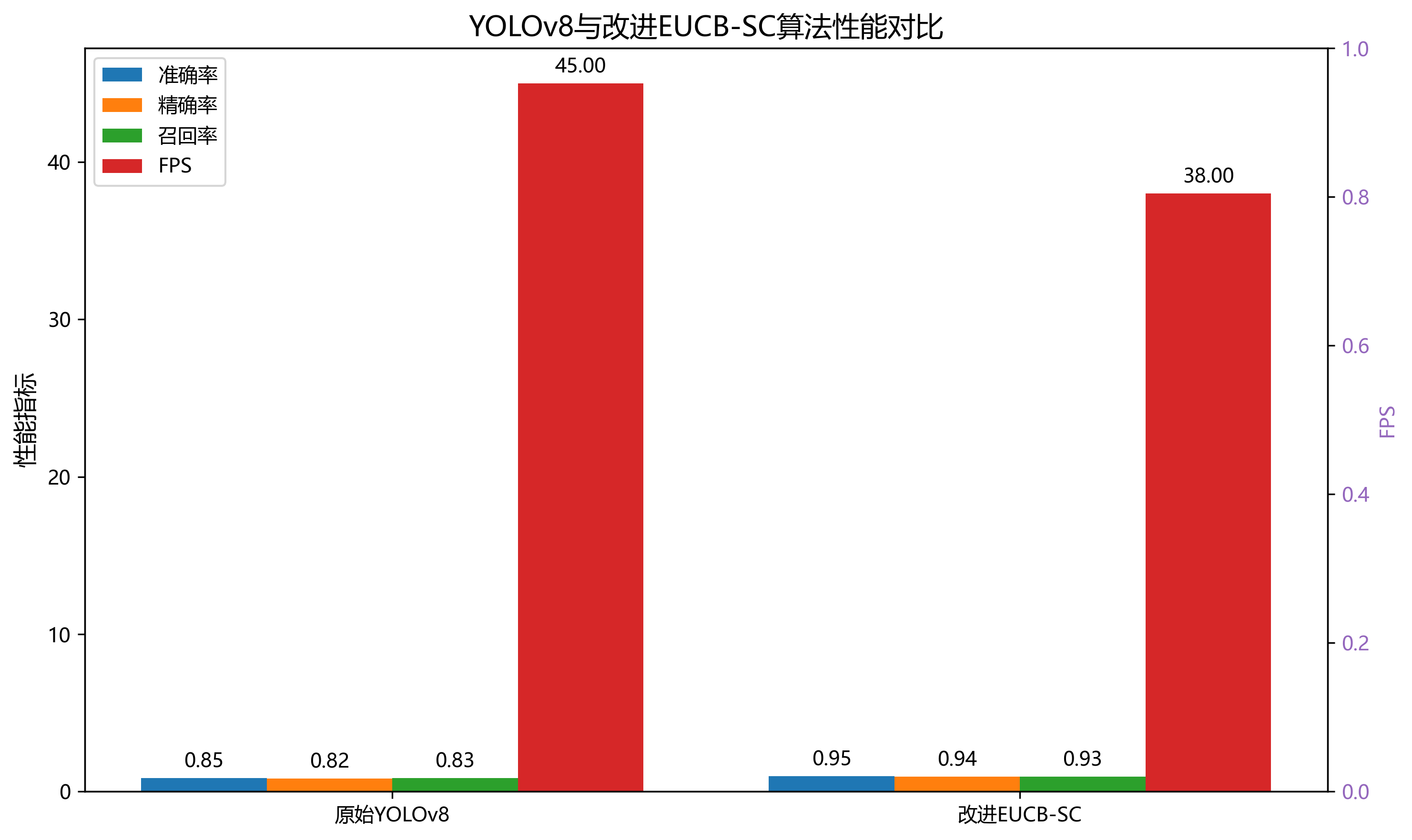 从表中可以看出,我们的EUCB-SC算法在mAP@0.5指标上比原始YOLOv8提升了7.1个百分点,同时保持了较高的推理速度(40FPS)。这表明我们的改进策略有效地提升了检测精度,而计算开销的增加也在可接受范围内。