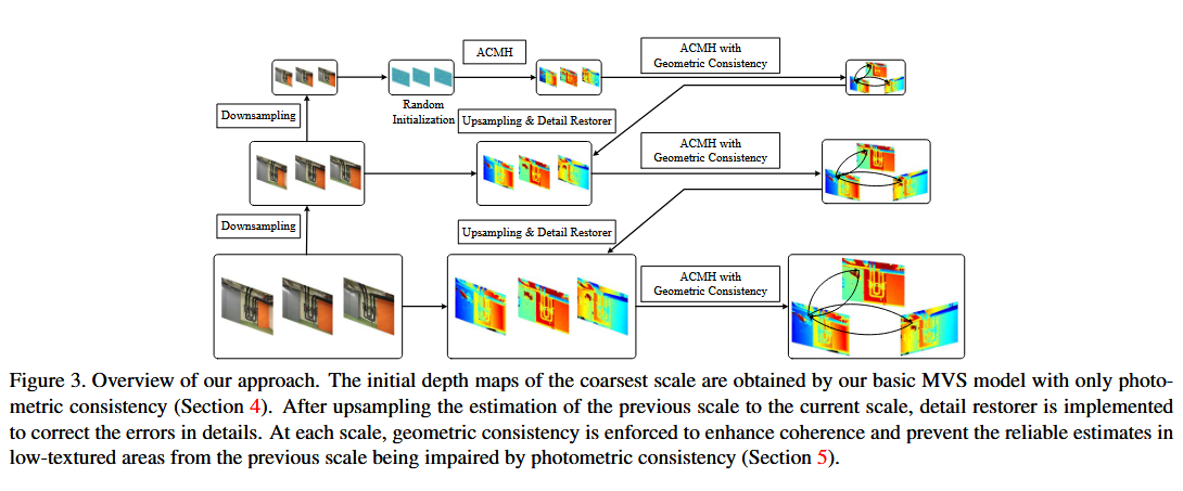 对于低纹理区域的深度估计,我们进一步提出将ACMH与多尺度几何一致性引导( ACMM )相结合,以获得低纹理区域在更粗尺度下的可靠深度估计,并保证其可以传播到更精细的尺度。此外,为了纠正由较粗尺度传播的错误估计,我们提出了一种新的细节恢复器。