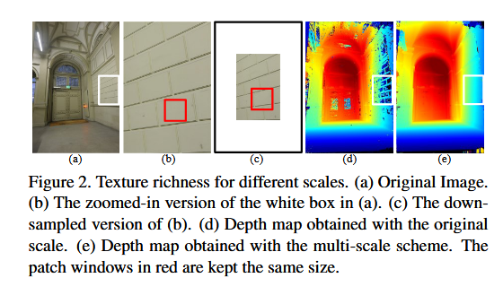 ACMM:低纹理区域的视觉相似性度量一直是一个具有挑战性的问题。如图2 ( b )所示,低纹理区域的低区分度导致视觉相似性的二义性,进一步降低了Patch Match Stereo方法的性能(图2 ( d ) )。然而,我们观察到,对于低纹理区域,虽然图2 ( b )中具有通用patch窗口的纹理信息并不显著,但当对图像进行下采样时,相同补丁窗口下的纹理信息变得更有区分度(图2 ( c ) )。也就是说,纹理丰富度是一个相对的度量。 那么,一个直观的想法是,我们可以在更粗的尺度上估计深度信息,以缓解低纹理区域的歧义性,并将其作为更精细尺度上匹配过程的指导。基于上述思想,本文进一步提出了一种基于几何一致性指导的多尺度块匹配算法( Multiscale patch matching with geometric consistency guidance,ACMM )。具体来说,我们的方法构建了图像金字塔,并在较粗的尺度上获得了低纹理区域的可靠深度估计。通过上采样将这些估计从较粗的尺度传播到较细的尺度后,我们利用几何一致性在细尺度上来约束深度估计。考虑到从较粗尺度到较细尺度的深度传播往往会导致细节信息的丢失,我们提出了一种基于相邻尺度间光度一致性差异图的细节恢复器。通过我们提出的策略,我们的方法不仅可以在低纹理区域估计深度信息,而且可以保留细节。
