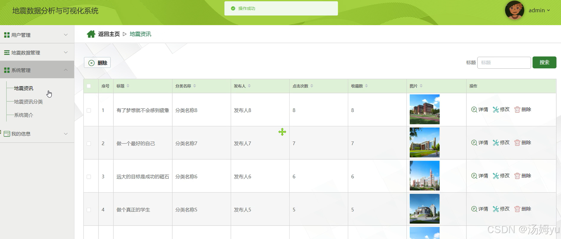 ECharts 是一个基于 JavaScript 的数据可视化库,在地震数据可视化分析系统中用于创建丰富的图表。它支持多种图表类型,如折线图可展示地震时间序列,柱状图对比不同地区地震频次,散点图呈现地震的空间分布。ECharts 的交互功能强大,用户可通过鼠标悬停查看详细数据,缩放图表聚焦特定区域。其高度可定制化,能根据地震数据特点调整图表样式和布局,以直观、清晰的方式呈现地震数据,帮助用户更好地理解地震活动规律。