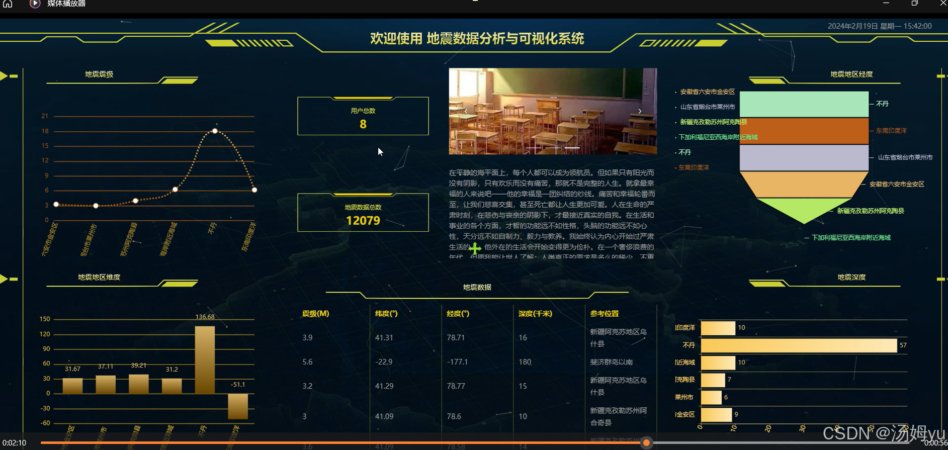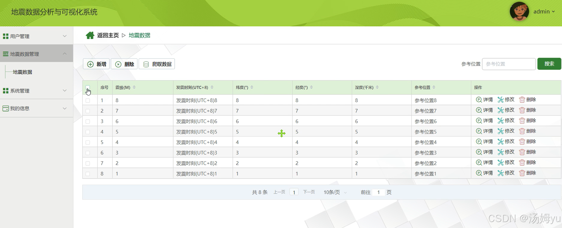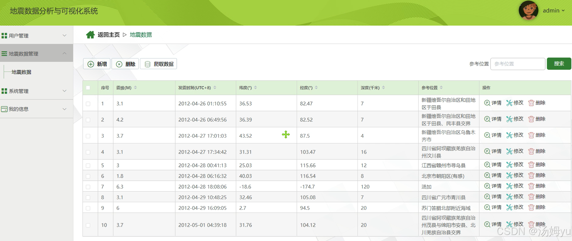 在此背景下,基于Python大数据技术的地震数据可视化分析系统应运而生。该系统通过整合Scrapy爬虫框架、PySpark分布式计算引擎与Plotly动态可视化库,构建起"数据采集-清洗-分析-展示"的全流程解决方案。其核心价值在于:利用Python生态的强扩展性,实现多源异构数据(如USGS全球数据、社交媒体舆情、气象卫星遥感)的融合分析;通过Spark内存计算技术,将地震序列关联分析的响应时间从传统方法的数小时压缩至分钟级;借助Plotly的交互式地理散点图与三维震源机制可视化,使非专业用户也能直观理解地震活动的空间分布特征。该系统的研发,标志着地震数据分析从"经验驱动"向"数据驱动"的范式转变,为提升地震预警精度与防灾减灾决策科学性提供了关键技术支撑。