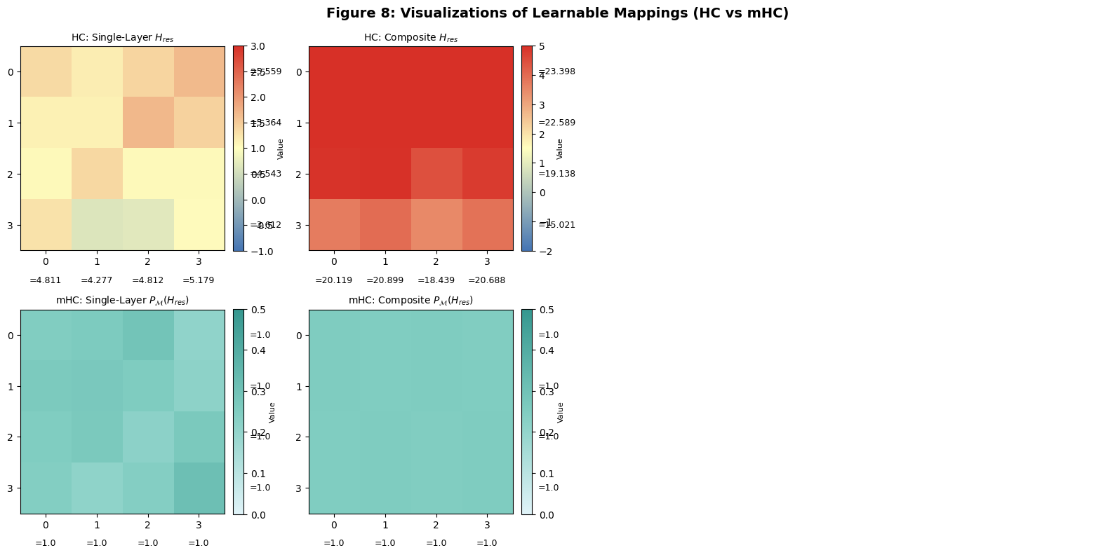 - 复现映射矩阵可视化(HC vs mHC,对应论文图 8)。