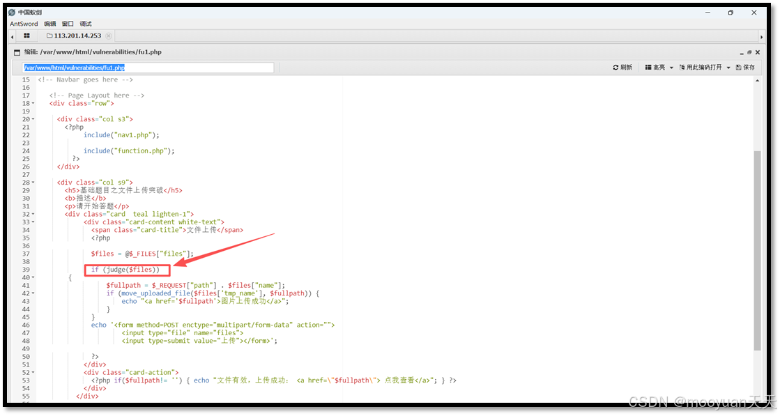 完整的源码内容如下所示,这是一个具有安全风险的文件上传页面,代码的含义是通过调用judge()函数对上传文件进行安全验证。