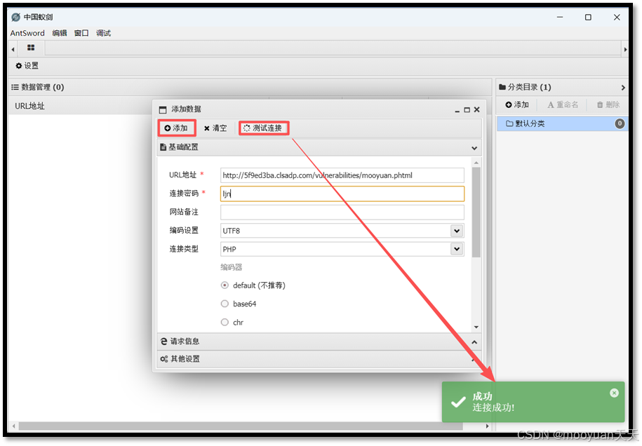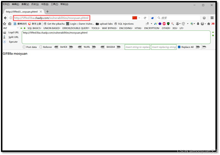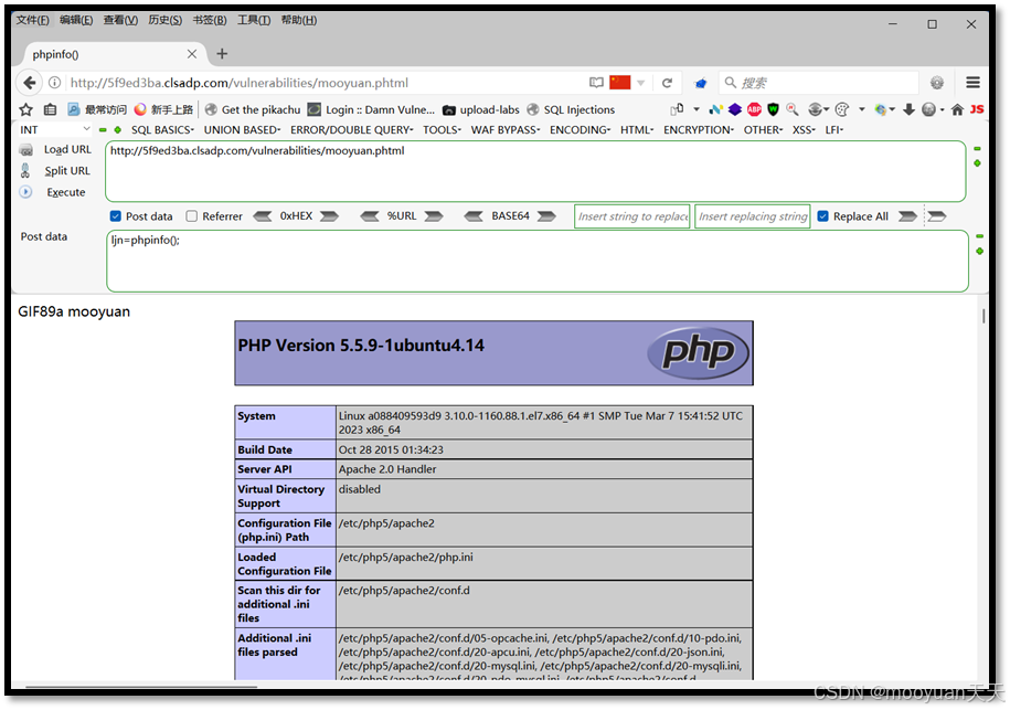 对于上传成功的脚本使用浏览器连接,通关hackbar进行post参数渗透,如下所示渗透成功。