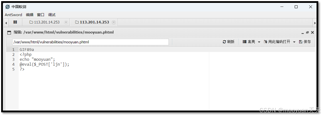 新建一个存放着一句话木马的php文件,脚本名为mooyuan.php。这段GIF89a文件头后嵌入PHP代码的文本,是一个伪装成GIF图片的WebShell后门。它利用图片文件头"GIF89a"绕过安全检查,当服务器被配置为将.gif文件解析为PHP时(如通过.htaccess设置),该文件就会被执行。其中的eval($_POST['ljn'])函数允许攻击者通过POST请求执行任意PHP代码,从而完全控制服务器,构成严重的安全威胁。
