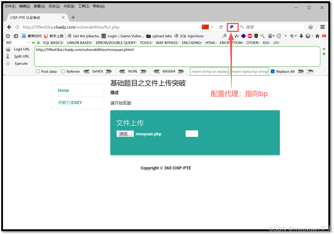 开启bp,同时浏览器代理指向bp,选择mooyuan.php文件并点击上传,如下所示。