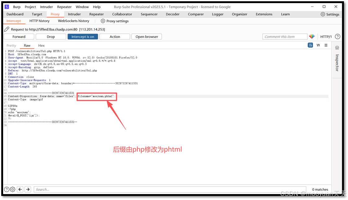 再次上传mooyuan.php,此时报文被bp拦截,具体如下所示。