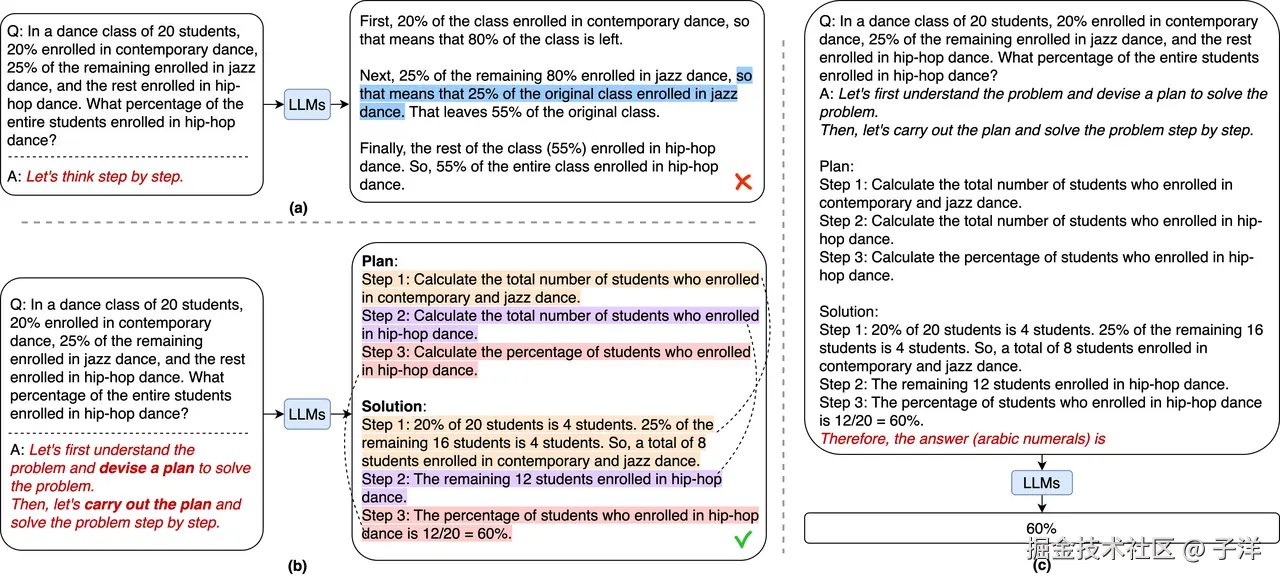 相比之下,P&E 论文中的这张图关注点就不太一样了。它并不是在强调系统流程,而是在强调 Plan 本身的作用。图中可以看到,模型并不是一开始就直接进入逐步推理或执行,而是先生成一个高层次的计划结构,然后再围绕这个计划逐步完成任务。