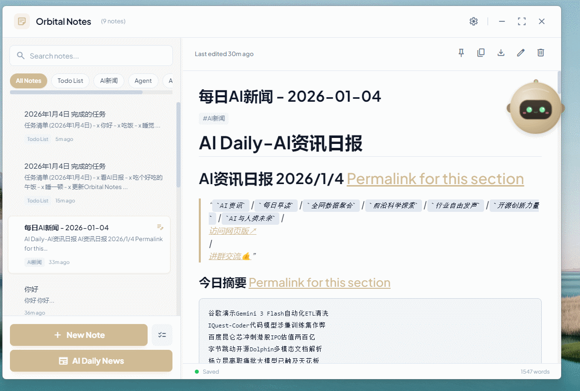 它是一款有温度的工具,一个在桌面边缘默默守护你创意的"卫星"。如果你也追求极致的记录效率和桌面美学,Orbital Notes 绝对值得一试!