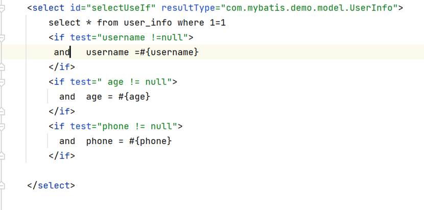为什么要这样写,首先,使用1=1先保底,否则如果用户没有输入任何东西,那么这个where会存在,也是会报错,后续只要用户输入其中的任何一个都会被if标签识别到,把if标签内部的拼接到SQL语句中去
