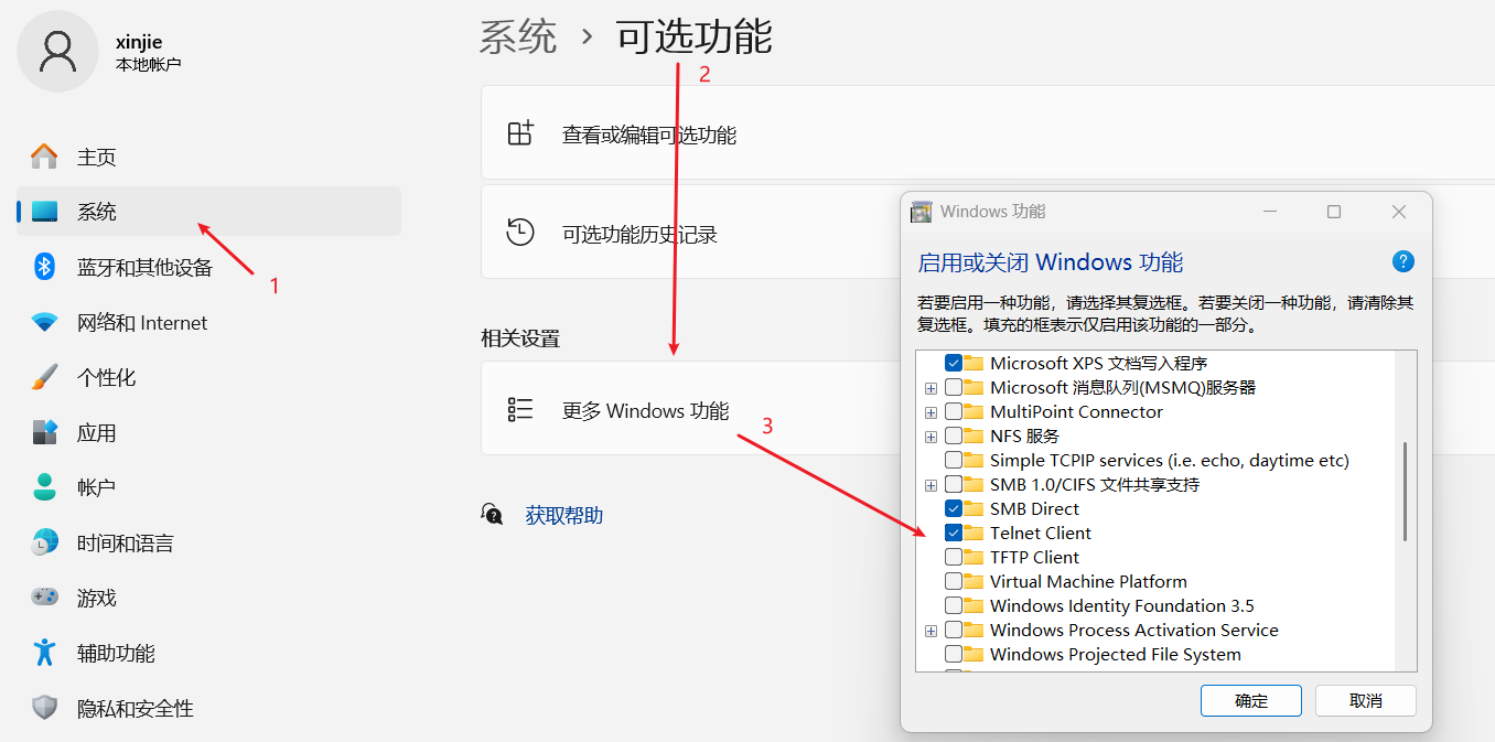 注意:现代系统可能默认未安装 Telnet,需要手动安装: