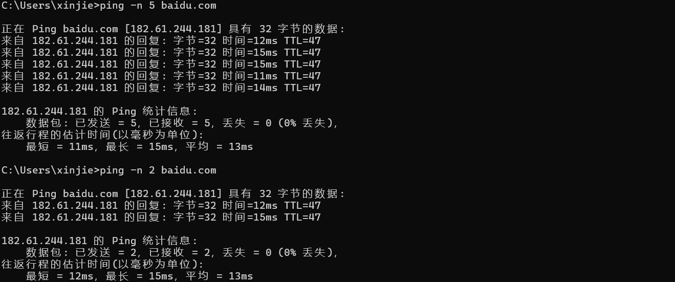 -c 数量:指定发送的 ICMP 包数量(Linux/macOS)-n 数量:指定发送的 ICMP 包数量(Windows)-t:持续 ping 直到手动停止(Windows)-i 间隔:设置 ping 包发送间隔(秒)-s 大小:设置 ping 包大小(字节)